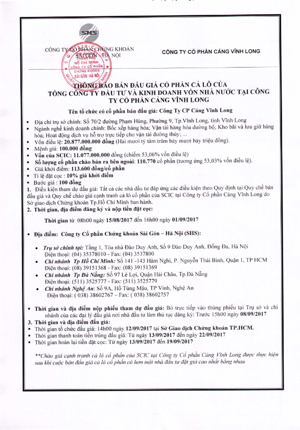 Thông báo bán đấu gía CP cả lô của Tổng CTy Đầu Tư Và Kinh Doanh Vốn Nhà Nước Tại Công Ty CP Cảng Vĩnh Long
