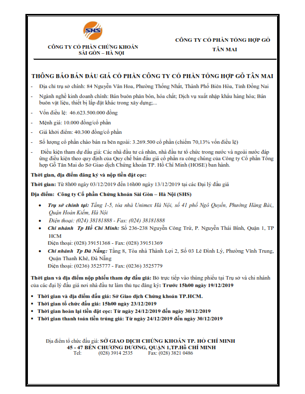 Thông báo bán đấu giá cp của Công ty Cổ phần Tổng hợp Gỗ Tân Mai