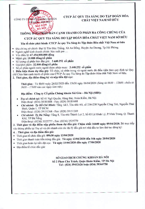 - Thông báo bán đấu giá cp của CTCP Pin Hà Nội do Tập đoàn hóa chất VN sở hữu - 12/03/2020