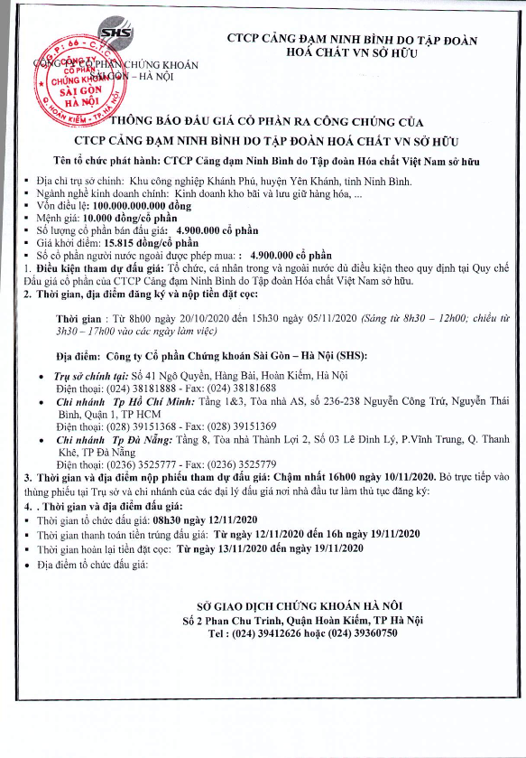 Thông báo bán đấu giá cp của CTCP Cảng Đạm Ninh Bình