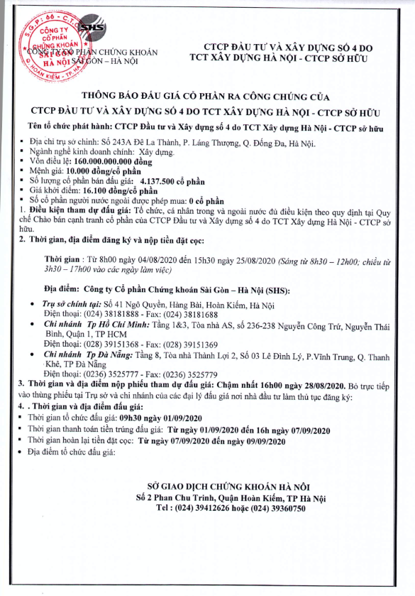 Thông báo bán đấu giá cp của CTCP Đầu tư và Xây dựng Số 4