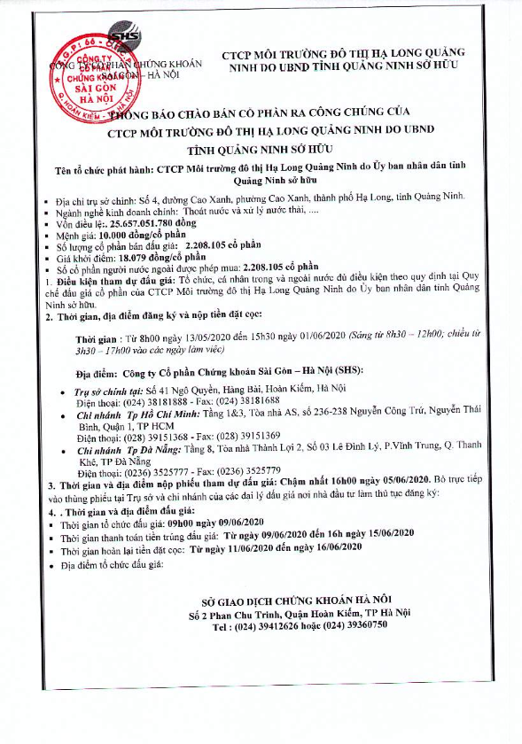 Thông báo bán đấu giá cp của CTCP Môi trường Đô thị Hạ Long Quảng Ninh do UBND Tỉnh Quảng Ninh sở hữu