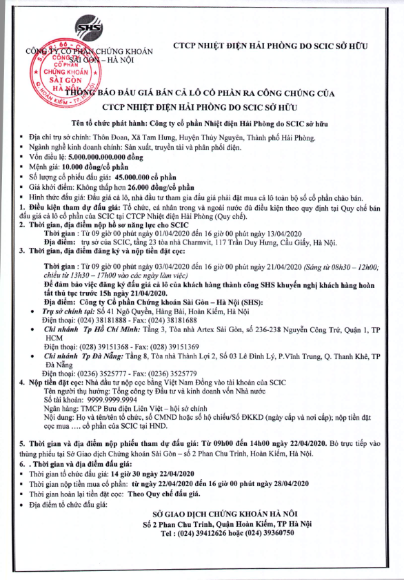 Thông báo bán đấu giá cp của CTCP Nhiệt Điện Hải Phòng do SCIC sở hữu