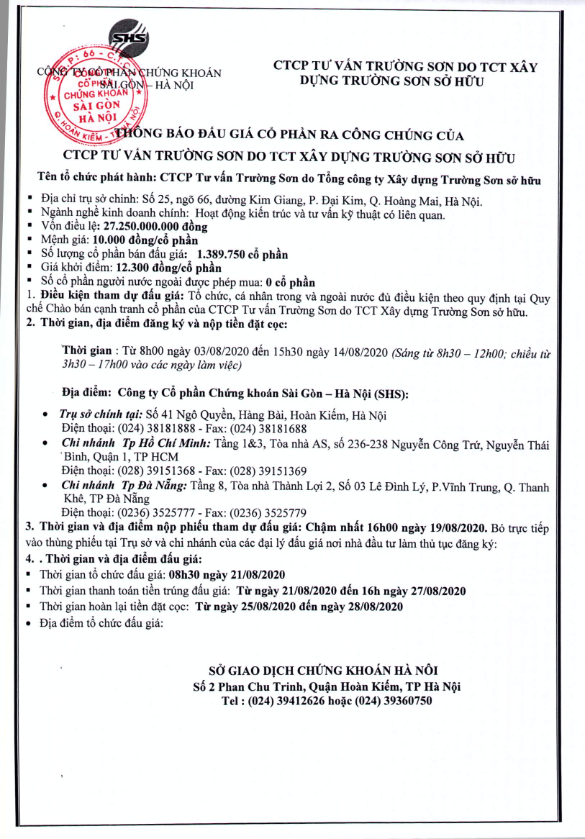 - Thông báo bán đấu giá cổ phần của Tổng Công ty Xây dựng Trường Sơn sở hữu tại CTCP Tư vấn Trường Sơn - 31/07/2020