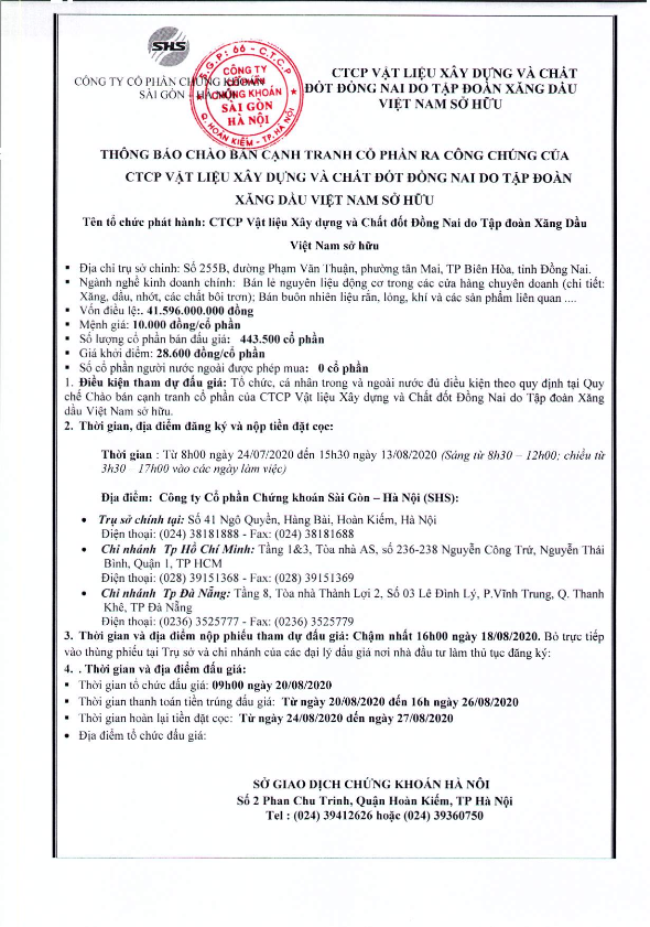 Thông báo bán đấu giá cp của CTCP Vật liệu Xây dựng và Chất đốt Đồng Nai do Tập đoàn Xăng dầu VN sở hữu