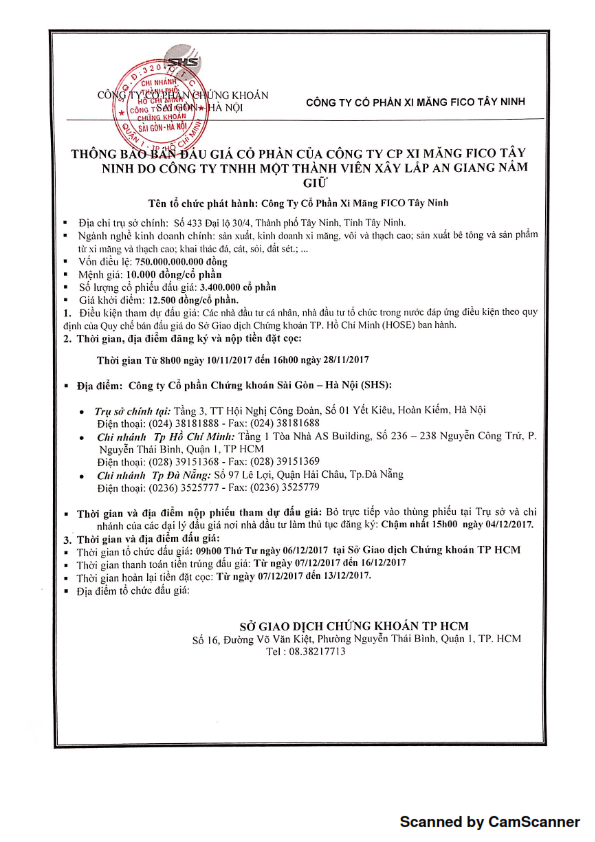 Thông báo bán đấu gía CP của CTCP Xi Măng FICO Tây Ninh do công ty TNHH MTV Xây Lắp An Giang nắm giữ