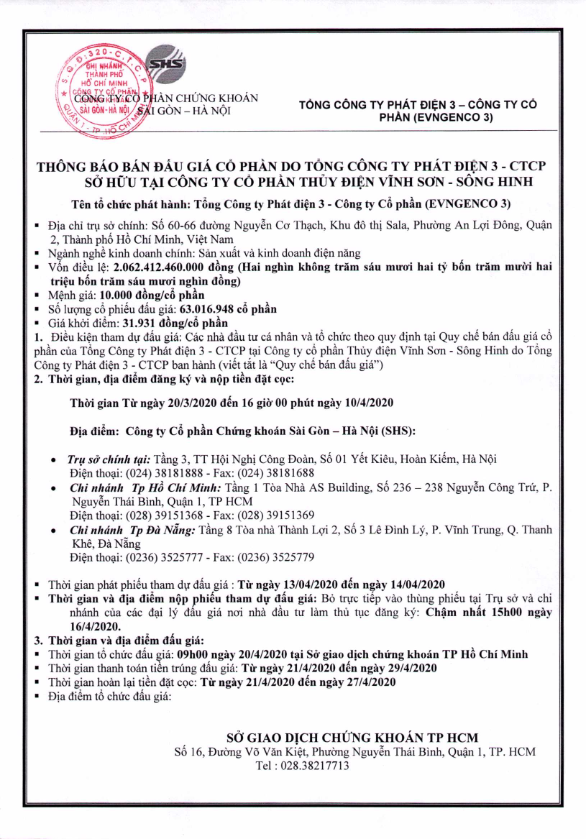 Thông báo bán đấu giá cp của Tổng Công ty Phát điện 3 – CTCP tại CTCP Thủy điện Vĩnh Sơn – Sông Hinh