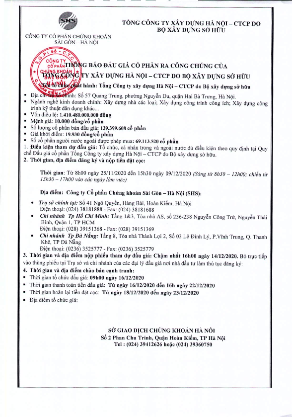 Thông báo bán đấu giá cp của Tổng công ty Xây dựng Hà Nội – CTCP do Bộ xây dựng sở hữu