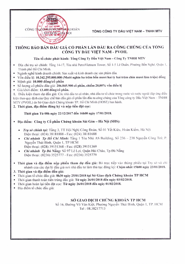 Thông báo bán đấu gía CP của Tổng Cty Dầu Việt Nam – TNHH MTV