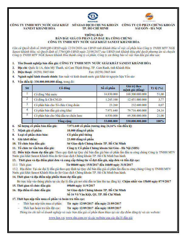 - THÔNG BÁO BÁN ĐẤU GIÁ CỔ PHẦN LẦN ĐẦU RA CÔNG CHÚNG CÔNG TY TNHH MTV NƯỚC GIẢI KHÁT SANNA KHÁNH HÒA - 14/08/2017