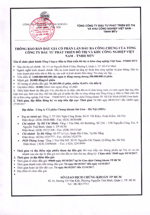 Thông báo bán đấu gía CP lần đầu ra công chúng Tổng Công Ty Đầu tư Phát triển Đô thị Và Khu công nghiệp Việt Nam – TNHH MTV