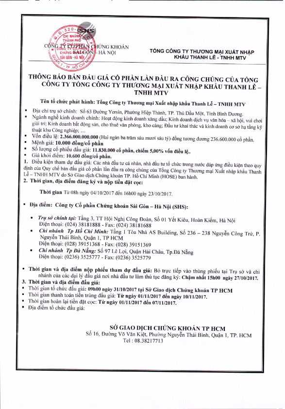 Thông báo bán đấu giá CP lần đầu ra công chúng Tổng Công Ty Thương mại Xuất nhập khẩu Thanh Lễ – TNHH MTV