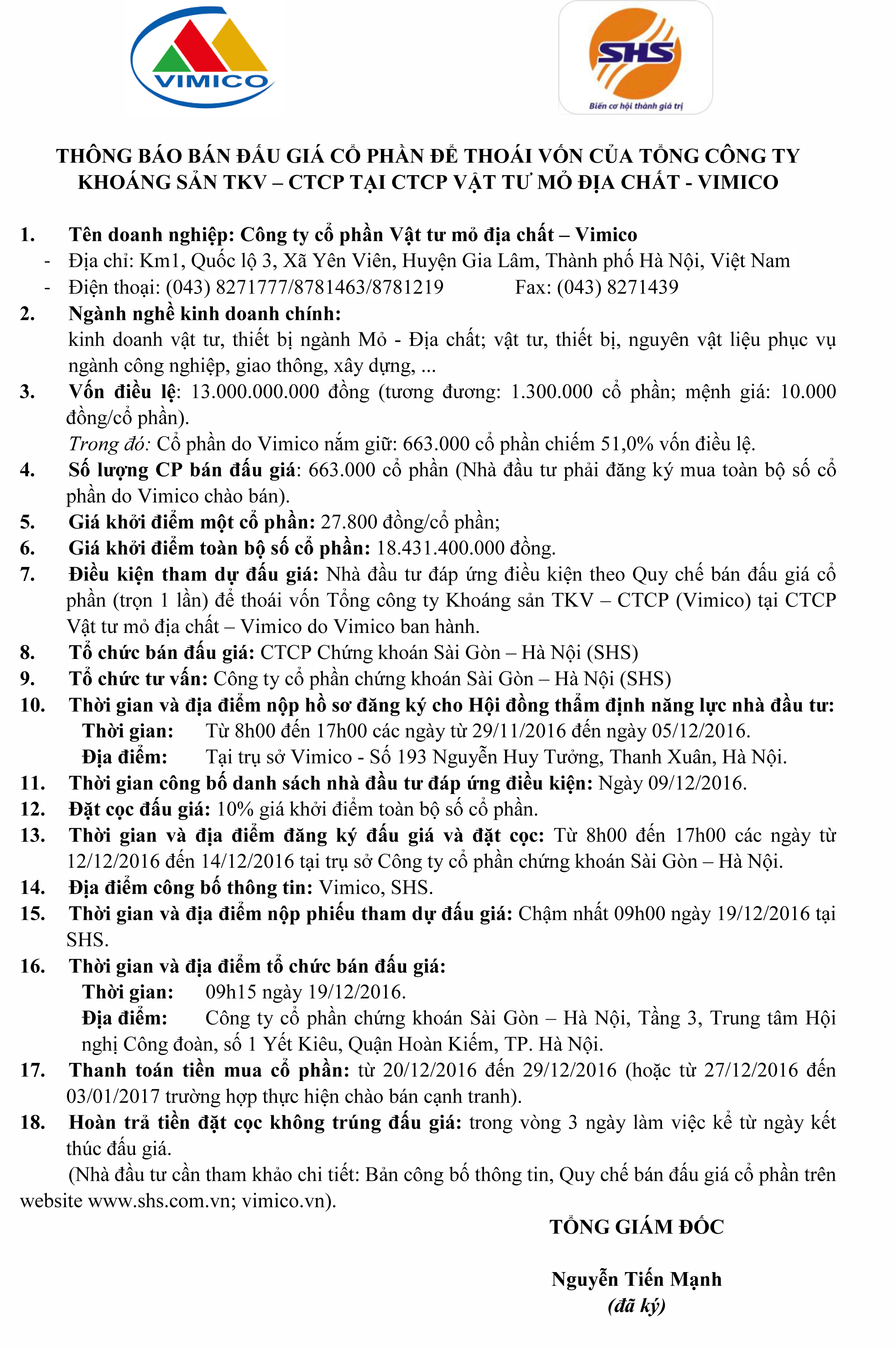 Thông báo bán đấu giá của VIMICO tại CTCP Vật tư mỏ địa chất