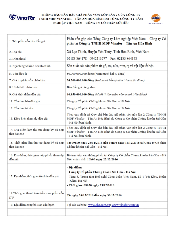 THÔNG BÁO BÁN ĐẤU GIÁ PHẦN VỐN GÓP LẦN 2 CỦA CÔNG TY TNHH MDF VINAFOR – TÂN AN HÒA BÌNH DO TỔNG CÔNG TY LÂM NGHIỆP VIỆT NAM – CÔNG TY CỔ PHẦN SỞ HỮU