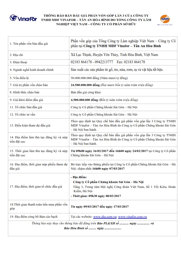 THÔNG BÁO BÁN ĐẤU GIÁ PHẦN VỐN GÓP LẦN 3 CỦA CÔNG TY TNHH MDF VINAFOR – TÂN AN HÒA BÌNH DO TỔNG CÔNG TY LÂM NGHIỆP VIỆT NAM – CÔNG TY CỔ PHẦN SỞ HỮU