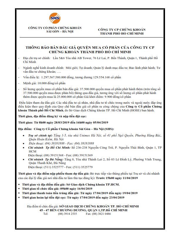 Thông báo bán đấu giá quyền mua cổ phần của CTCP Chứng khoán Thành phố Hồ Chí Minh