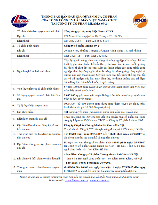 THÔNG BÁO BÁN ĐẤU GIÁ QUYỀN MUA CỔ PHẦN CỦA TỔNG CÔNG TY LẮP MÁY VIỆT NAM – CTCP TẠI CÔNG TY CỔ PHẦN LILAMA 69-2