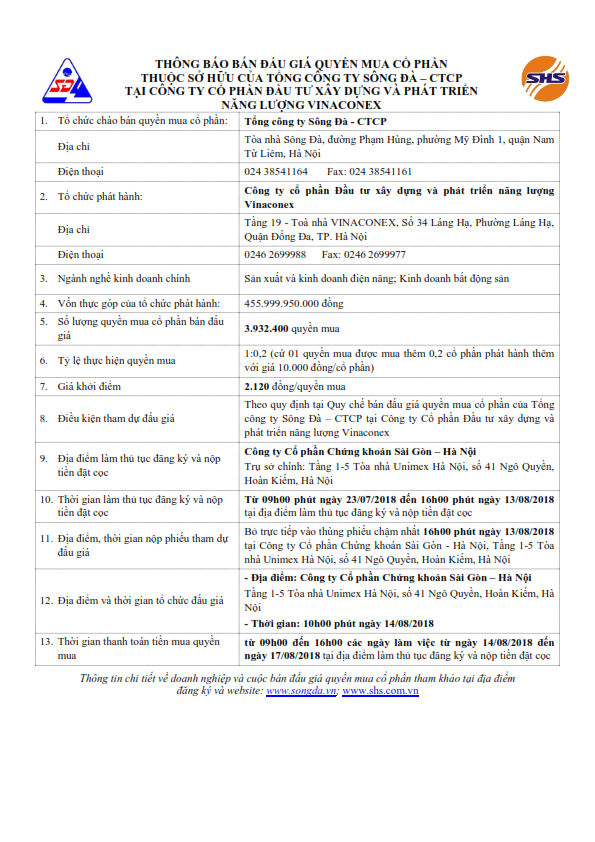 Thông báo bán đấu giá quyền mua cổ phần của Tổng công ty Sông Đà – CTCP tại Công ty cổ phần Đầu tư xây dựng và phát triển năng lượng Vinaconex