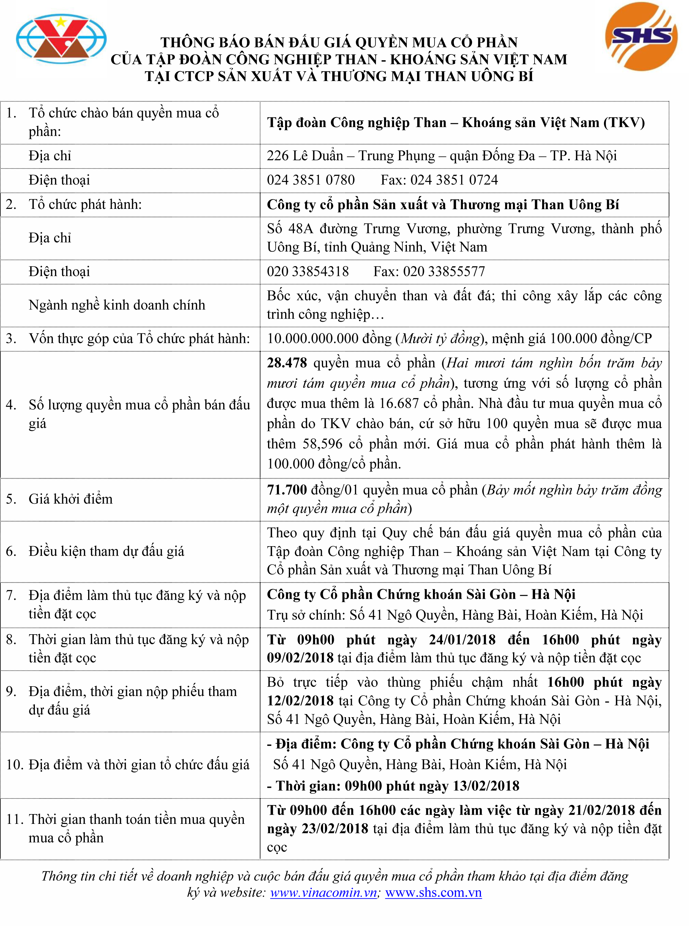 Thông báo bán đấu giá quyền mua cổ phiếu của Tập đoàn công nghiệp Than - Khoáng sản Việt Nam tại CTCP Sản xuất và Thương mại Than Uông Bí
