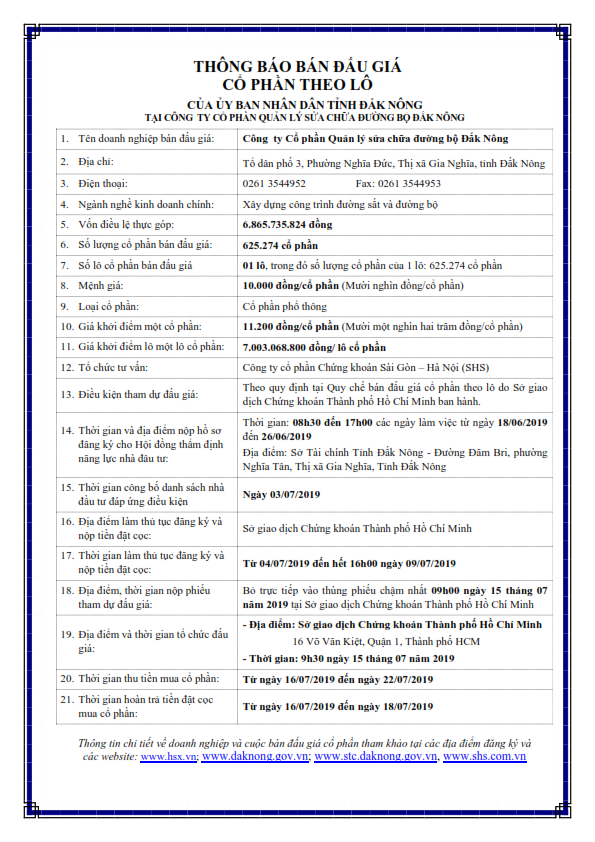 Thông báo bán đấu giá theo lô cổ phần của UBND tỉnh Đắk Nông tại CTCP Quản lý sửa chữa đường bộ Đắk Nông