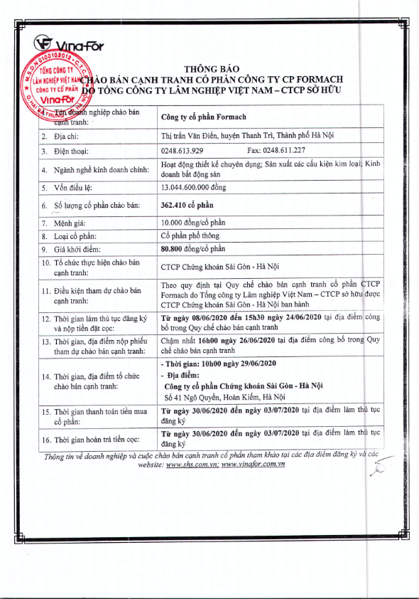 Thông báo chào bán cạnh tranh cổ phần CTCP Formach do TCT Lâm nghiệp Việt Nam - CTCP sở hữu