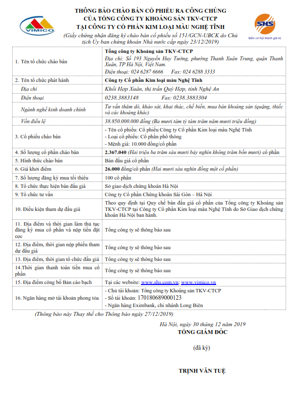 Thông báo chào bán cổ phiếu ra công chúng của Tổng công ty Khoáng sản TKV-CTCP tại Công ty Cổ phần Kim loại màu Nghệ Tĩnh