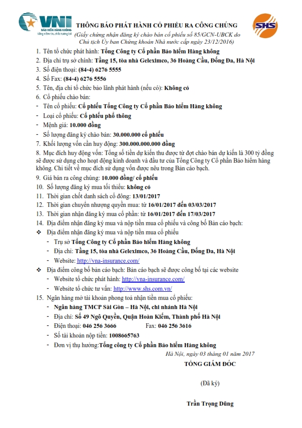 Thông báo chào bán cổ phiếu ra công chúng - Tổng Công ty Cổ phần Bảo hiểm Hàng không