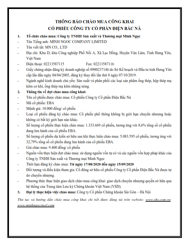 Thông báo chào mua công khai cổ phiếu CTCP Điện Bắc Nà