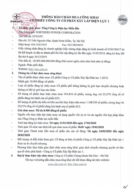 Thông báo chào mua công khai cổ phiếu CTCP Xây lắp Điện lực 1 của Tổng Công ty Điện lực Miền Bắc