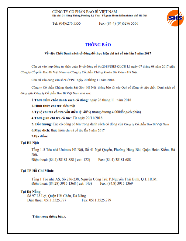 Thông báo chi trả cổ tức lần 3 năm 2017 cho cổ đông Công ty cổ phần Bao Bì Việt Nam