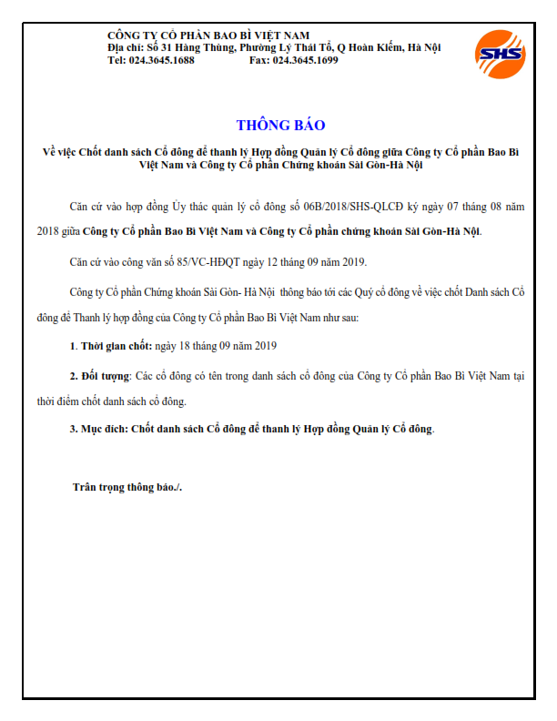 Thông báo Chốt danh sách Cổ đông để thanh lý Hợp đồng Quản lý Cổ đông của Công ty Cổ phần Bao Bì Việt Nam