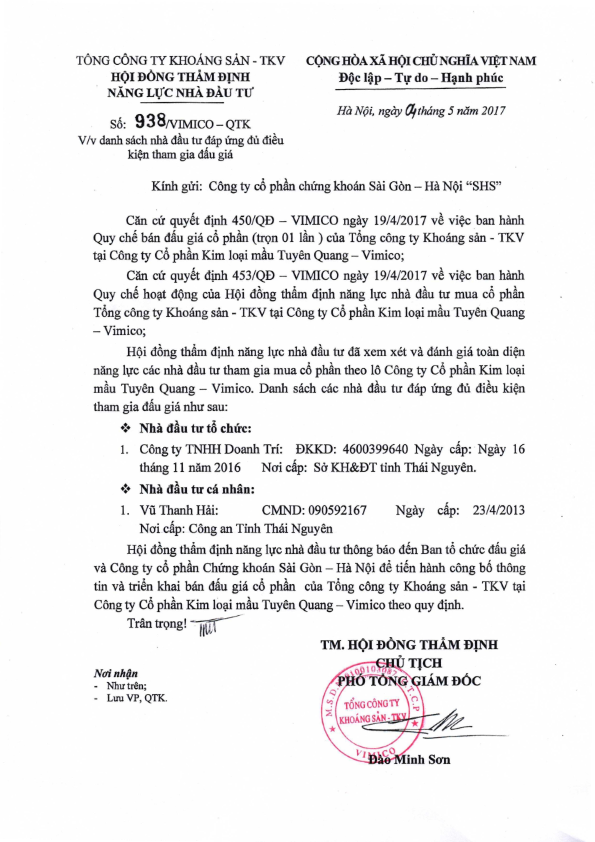 Thông báo danh sách NĐT đủ điều kiện đăng ký mua cổ phần CTCP Kim loại màu Tuyên Quang - Vimico