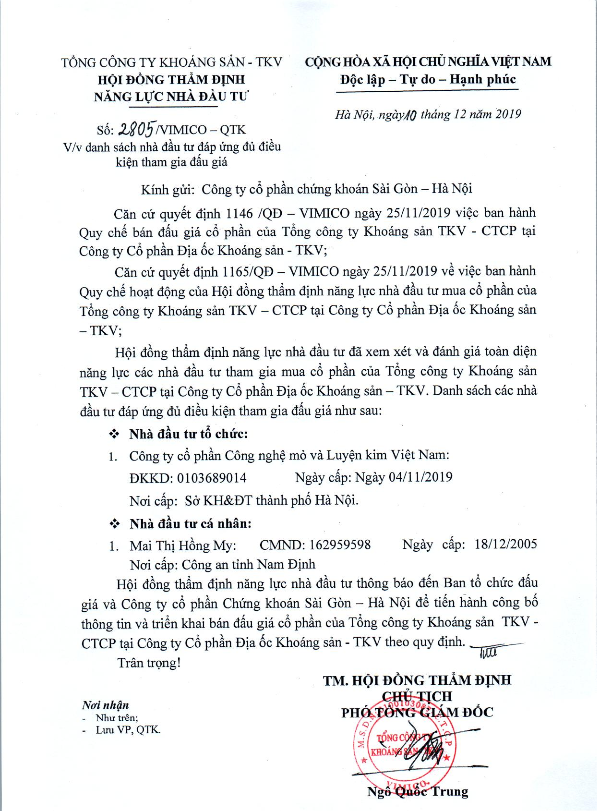 Thông báo Danh sách nhà đầu tư đủ điều kiện mua cổ phiếu theo lô Công ty Cổ phần Địa ốc Khoáng sản – TKV