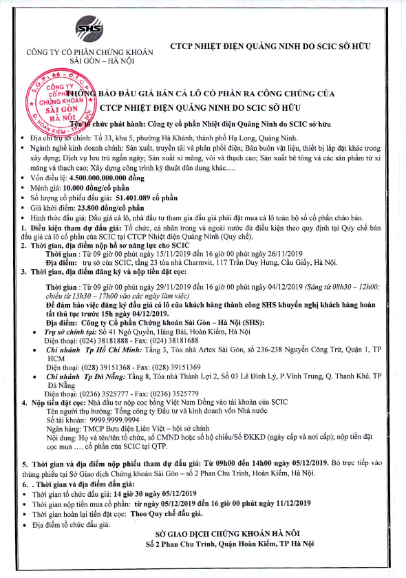 Thông báo đấu giá bán cả lô cổ phần ra công chúng của CTCP Nhiệt Điện Quảng Ninh do SCIC sở hữu