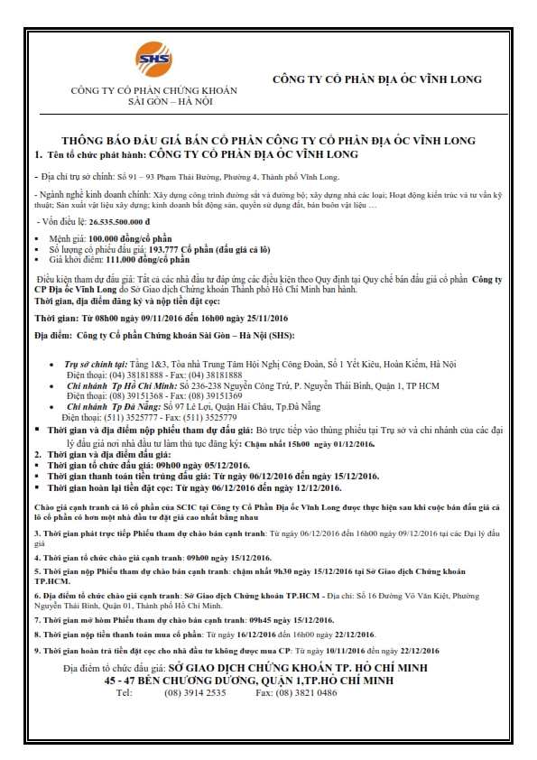 Thông báo đấu giá bán cổ phần công ty cổ phần địa ốc Vĩnh Long