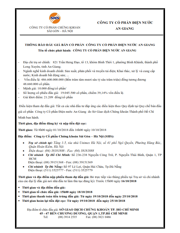 Thông báo đấu giá bán cổ phần công ty cổ phần Điện nước An Giang