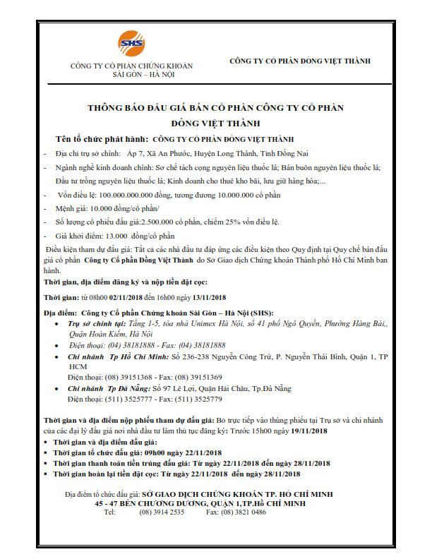 Thông báo đấu giá bán cổ phần công ty cổ phần Đồng Việt Thành
