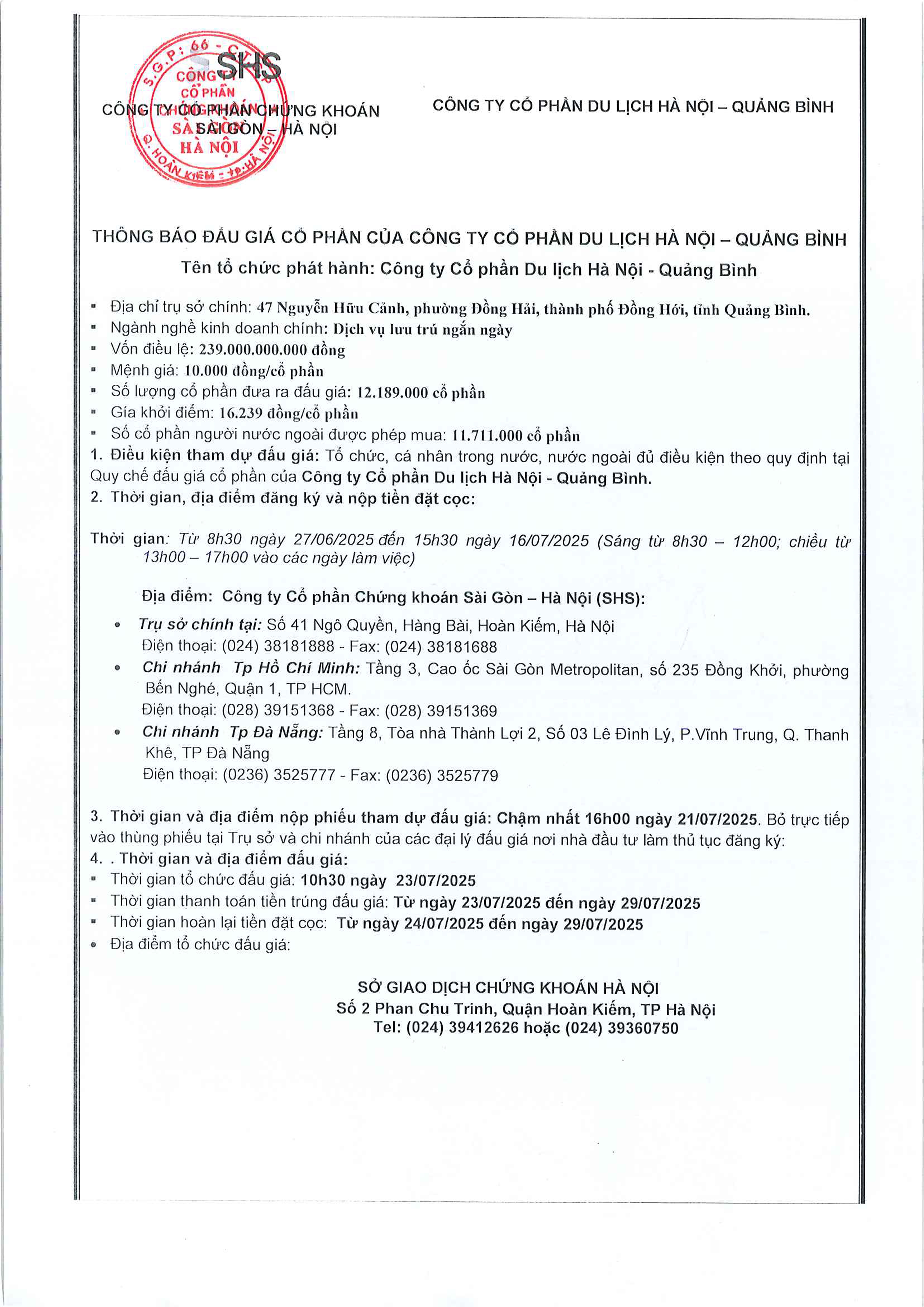 Thông báo đấu giá bán cổ phần Công ty Cổ phần Du lịch Hà Nội - Quảng Bình