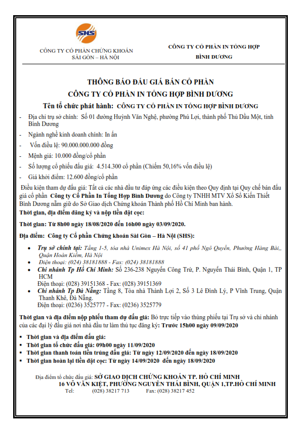 Thông báo đấu giá bán cổ phần Công ty Cổ Phần In Tổng hợp Bình Dương