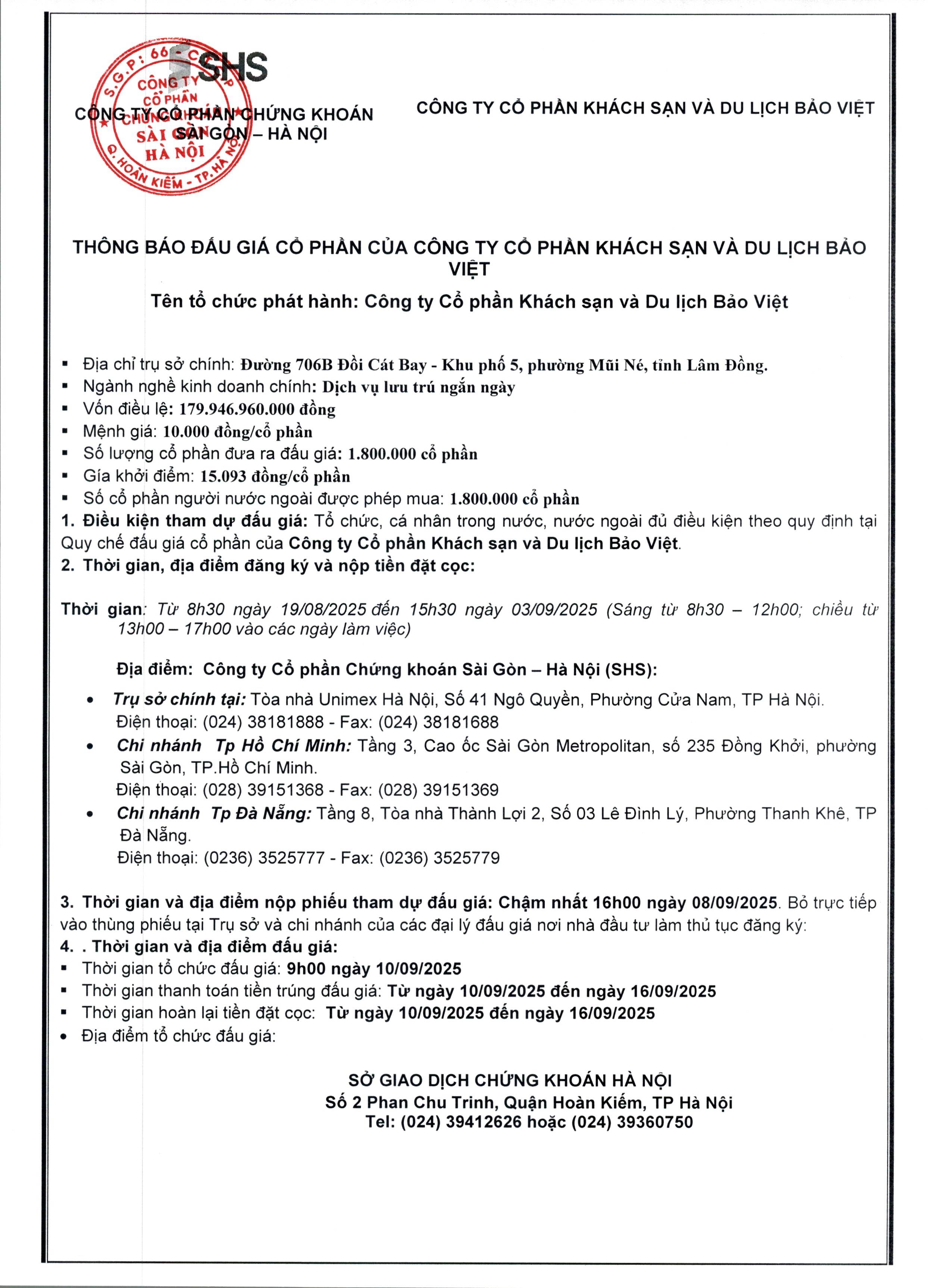 Thông báo đấu giá bán cổ phần Công ty Cổ phần Khách sạn và Du lịch Bảo Việt