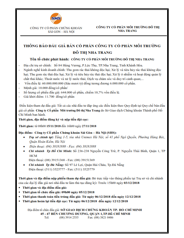 Thông báo đấu giá bán cổ phần Công ty Cổ phần Môi trường Đô thị Nha Trang