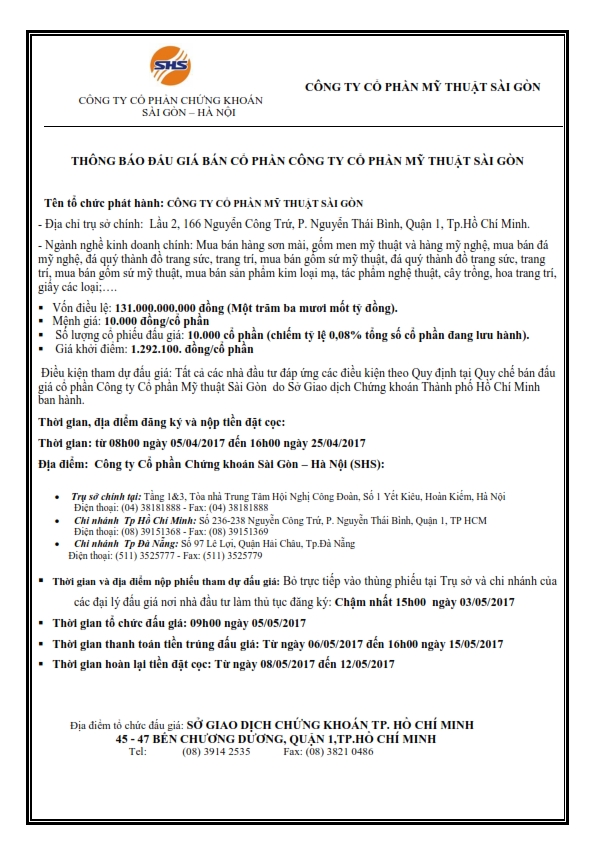 Thông báo đấu giá bán cổ phần Công ty cổ phần Mỹ thuật Sài Gòn