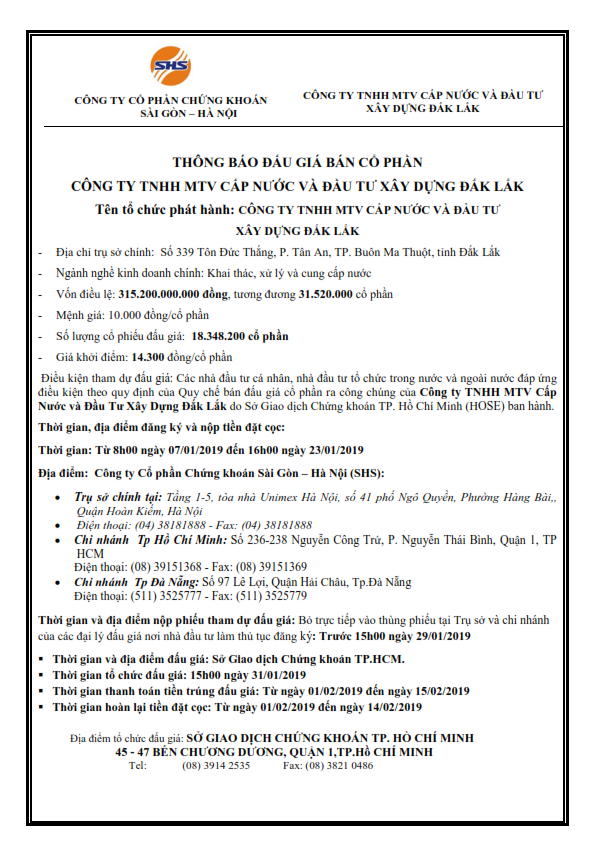 - Thông báo đấu giá bán cổ phần Công ty TNHH MTV Đô Thị và Môi Trường Đắk Lắk - 04/01/2019