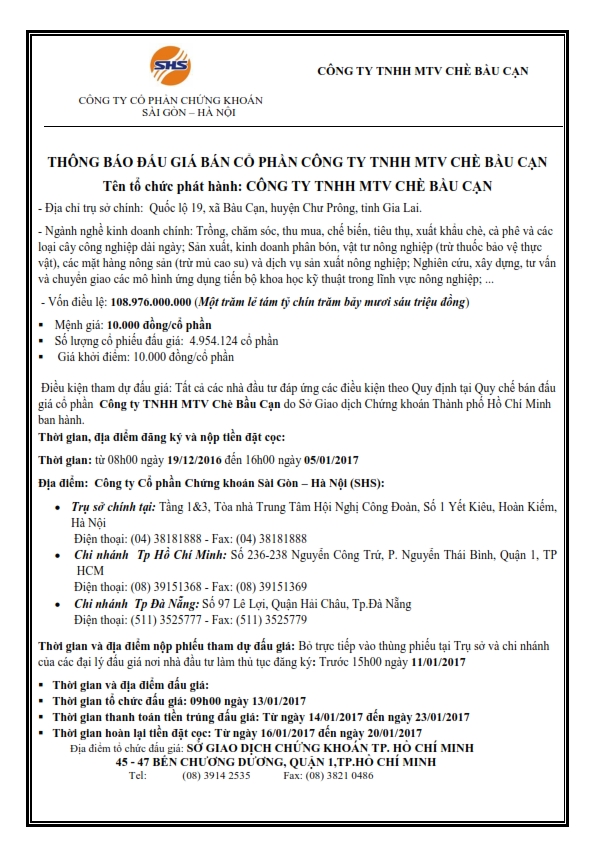 THÔNG BÁO ĐẤU GIÁ BÁN CỔ PHẦN CÔNG TY TNHH MTV CHÈ BẦU CẠN
