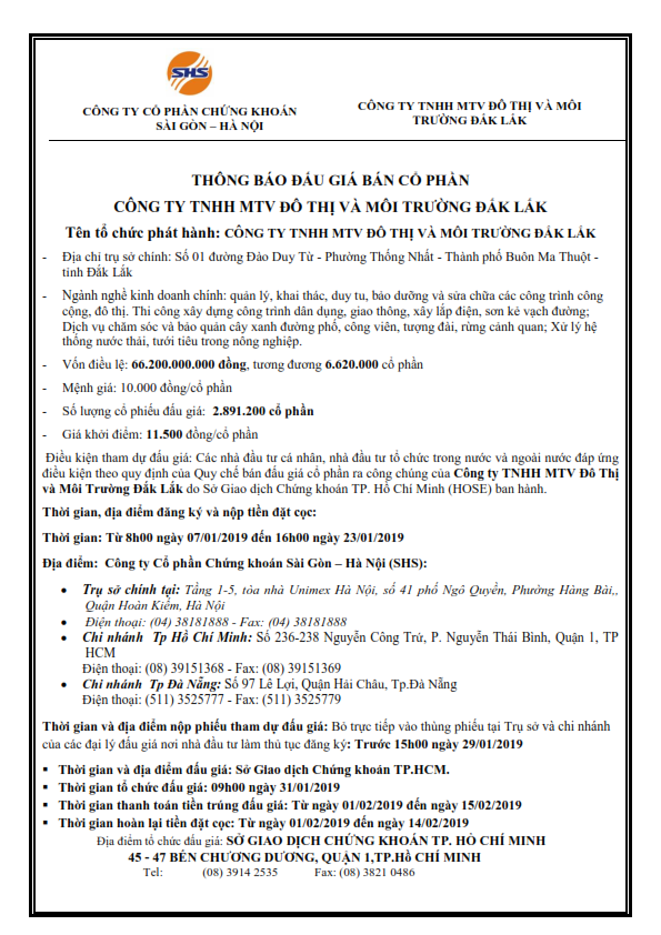 - Thông báo đấu giá bán cổ phần Công ty TNHH MTV Cấp Nước và Đầu Tư Xây Dựng Đắk Lắk - 04/01/2019