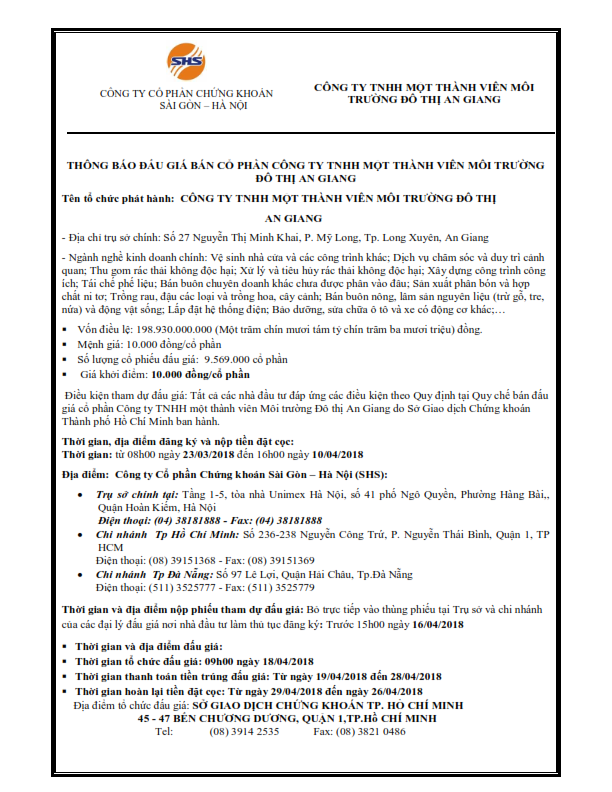 Thông báo đấu giá bán cổ phần Công ty TNHH MTV Môi trường đô thị An Giang