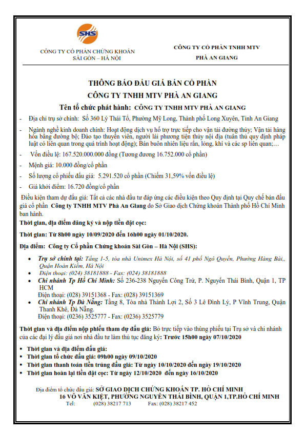 Thông báo đấu giá bán cổ phần Công ty TNHH MTV Phà An Giang