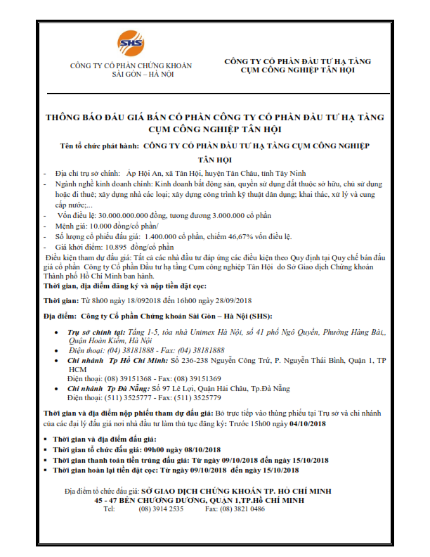 Thông báo đấu giá bán cổ phần CTCP Đầu tư hạ tầng Cụm công nghiệp Tân Hội