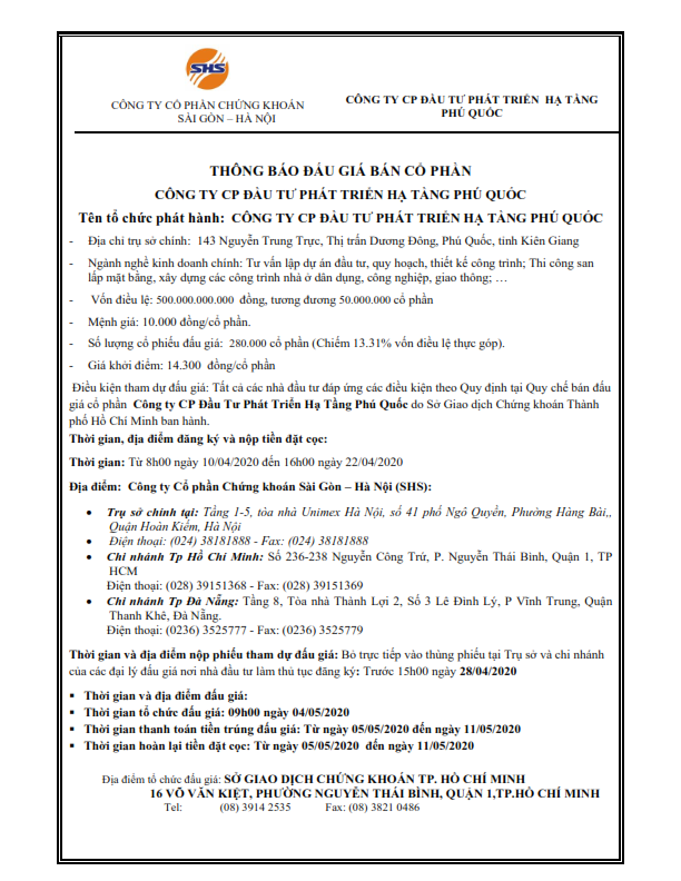 Thông báo đấu giá bán cổ phần CTCP Đầu Tư Phát Triển Hạ Tầng Phú Quốc