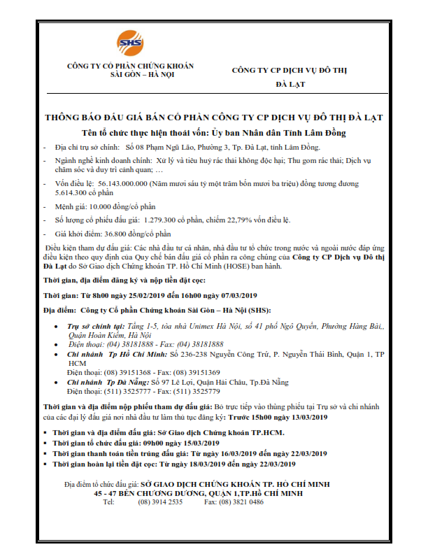 Thông báo đấu giá bán cổ phần CTCP Dịch vụ đô thị Đà Lạt